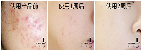 使用后狀態(tài):使用2周后,痘痘紅腫消退,不留痘印痘痕,皮膚更光滑細(xì)膩。