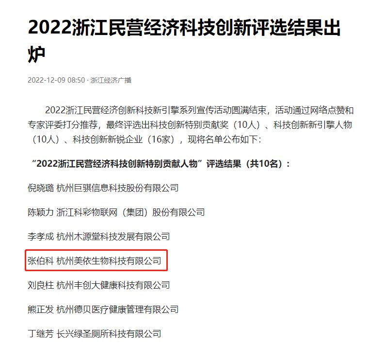 送人玫瑰手留香,博士為民好榜樣。2022年12月9日,浙江經(jīng)濟(jì)廣播宣布本次活動(dòng)圓滿結(jié)束,并公布了最終結(jié)果。通過幾輪的網(wǎng)絡(luò)點(diǎn)贊和專業(yè)的專家評(píng)委打分,最終評(píng)選出科技創(chuàng)新特別貢獻(xiàn)獎(jiǎng)(10人)、科技創(chuàng)新新引擎人物(10人)、科技創(chuàng)新新銳企業(yè)(16家)。杭州美依公司創(chuàng)始人——張伯科博士在本次活動(dòng)中有幸被評(píng)為“2022浙江民營(yíng)經(jīng)濟(jì)科技創(chuàng)新特別貢獻(xiàn)人物”,本次榮譽(yù)的獲得,也是對(duì)張伯科博士十年以來,在科技創(chuàng)新領(lǐng)域成就的肯定和嘉獎(jiǎng)。