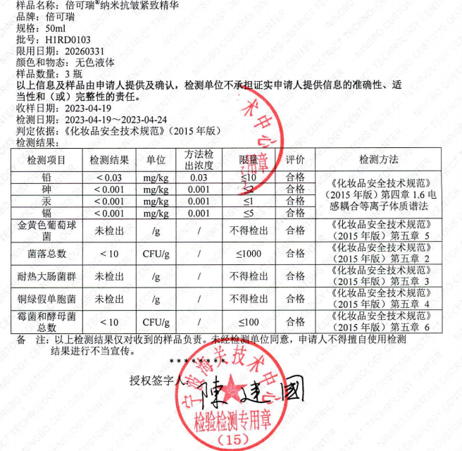 倍可瑞®納米抗皺緊致精華是國(guó)家藥品監(jiān)督管理局審核全項(xiàng)目合格備案通過(guò)的產(chǎn)品,經(jīng)過(guò)專業(yè)的機(jī)構(gòu)檢測(cè),無(wú)激素、無(wú)任何重金屬和菌落超標(biāo),在產(chǎn)品安全性上,消費(fèi)者可以放心購(gòu)買使用。