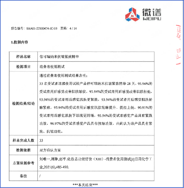 通過(guò)權(quán)威機(jī)構(gòu)的人體試驗(yàn),產(chǎn)品消費(fèi)者使用測(cè)試結(jié)果表明:33名受試者連續(xù)使用試驗(yàn)產(chǎn)品倍可瑞納米抗皺緊致精華28天,93.94%的受試者用后感覺(jué)肌膚更緊致,93.94%的受試者用后感覺(jué)肌膚輪廓緊致,93.94%的受試者用后感覺(jué)肌膚輪廓提升、提拉上揚(yáng),90.91%的受試者用后感覺(jué)肌膚下頜線更清晰,93.94%的受試者感覺(jué)產(chǎn)品具有緊致功效,96.97%的受試者感覺(jué)產(chǎn)品具有抗皺功效。