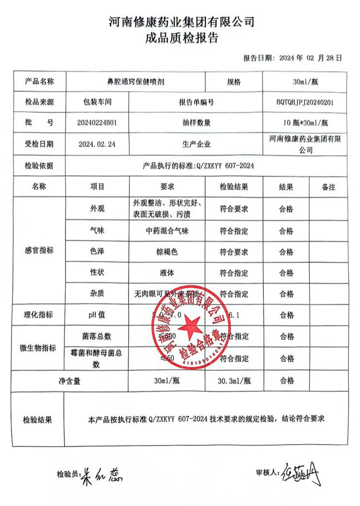 鼻腔通竅保健噴劑檢測(cè)報(bào)告