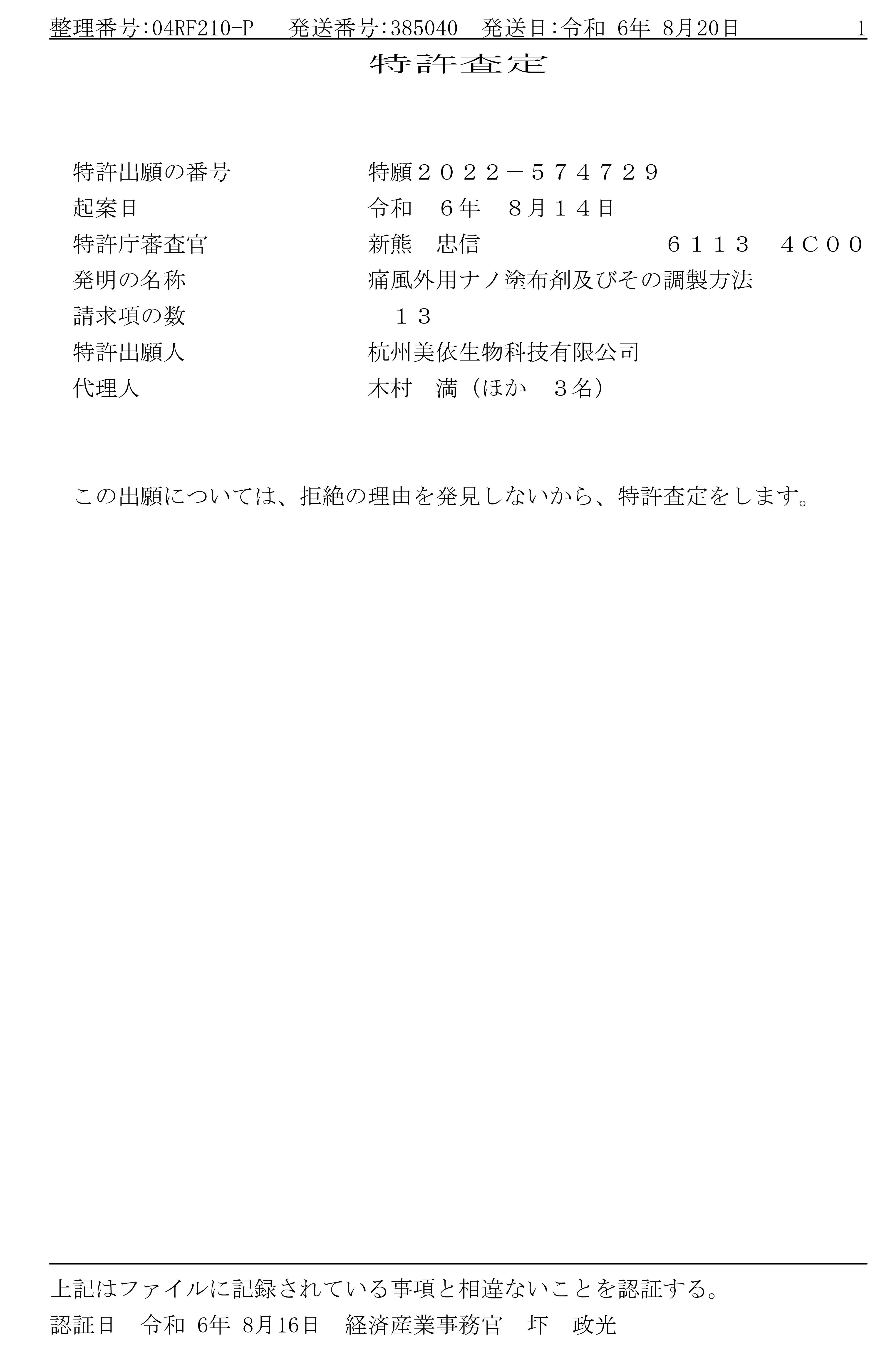 今日,杭州美依生物科技有限公司正式收到日本國家專利局頒發(fā)的PCT國際發(fā)明專利審查通知,通知顯示:由杭州美依生物科技有限公司申請的“痛風(fēng)外用ナノ塗布劑及びその調(diào)製方法(痛風(fēng)外用納米涂抹劑及其制備方法)”發(fā)明專利已正式通過審批。